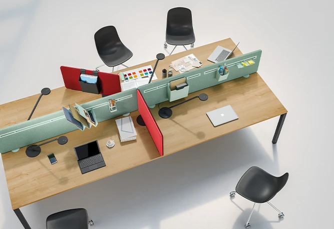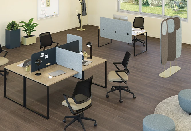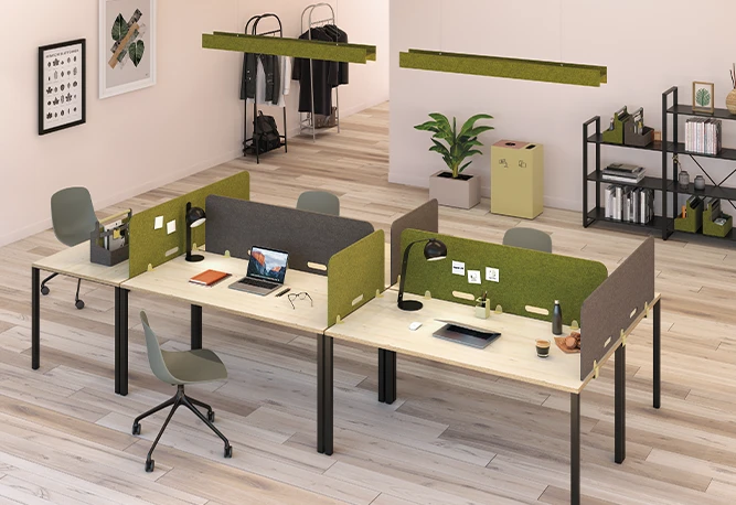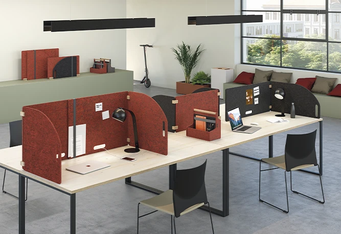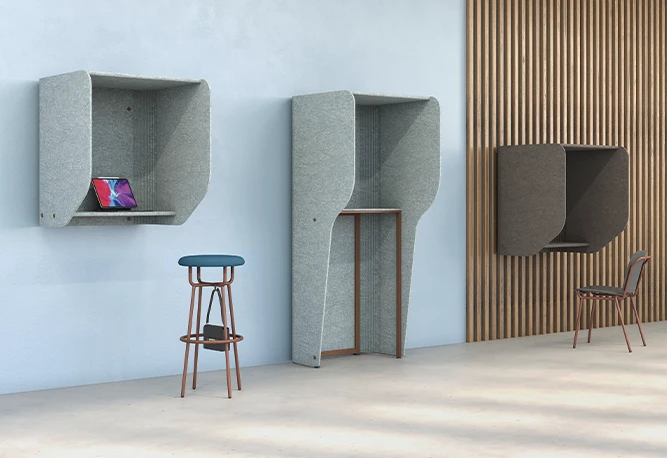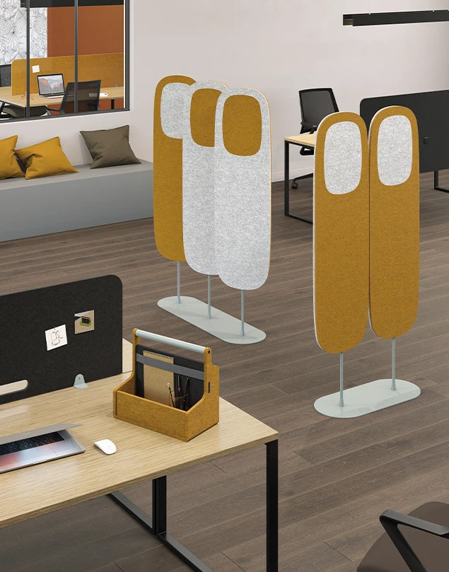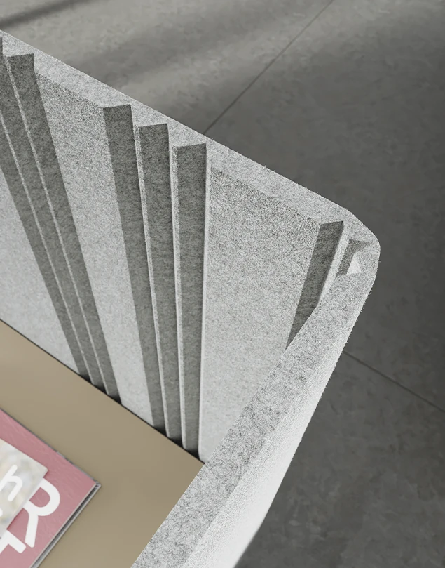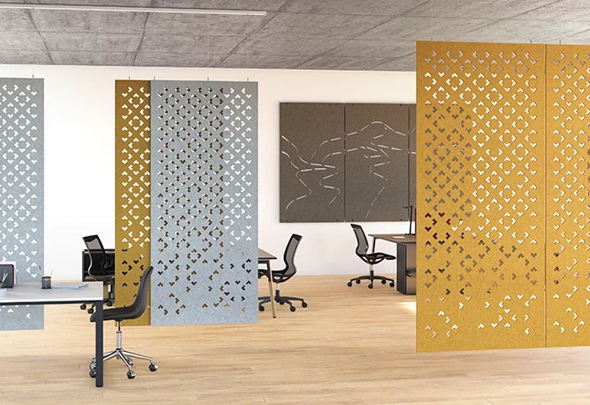 En nuestro portfolio tenemos tanto soluciones fonoabsorbentes de catálogo (paneles de pie, suspendidos a techo, murales, de sobremesa fijos o autoportantes…) como la posibilidad de realizar elementos a medida partiendo de diseños y necesidades específicas, trabajando el cortado y troquelado de paneles de fieltro PET fonoabsorbentes certificados, y con múltiples opciones para optimizar su instalación y dar los mejores resultados.